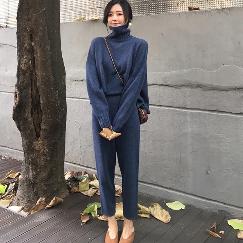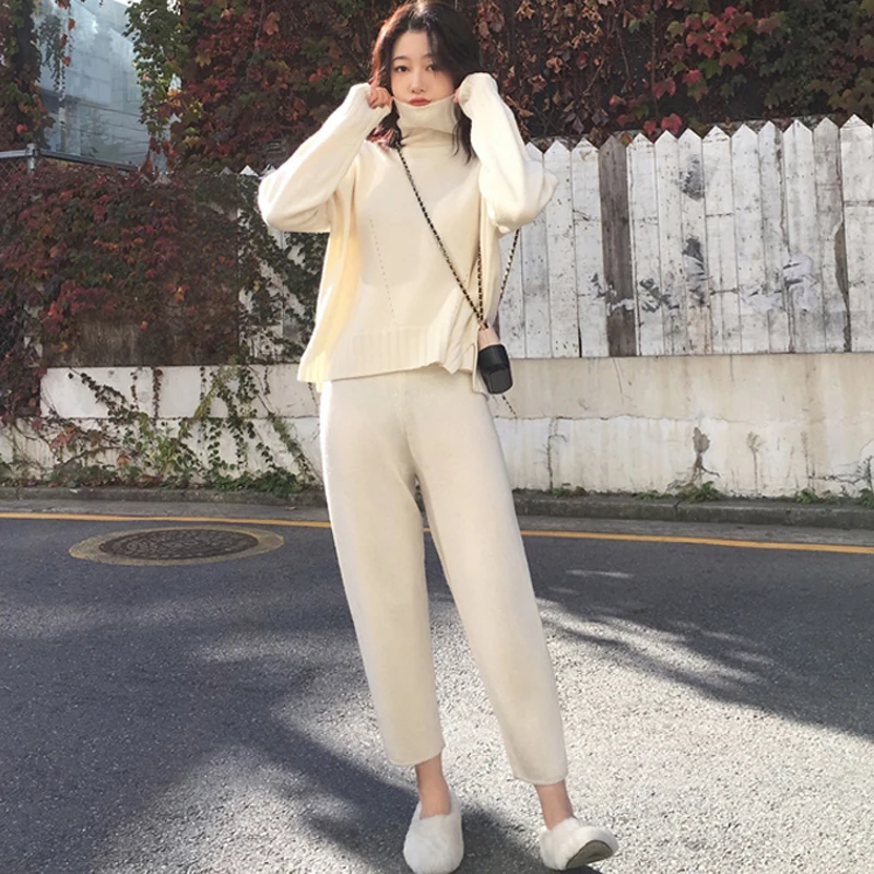 Buy Casual Sweater Pants Knitted 2 Pieces Set Turtleneck Pullovers & Elastic Waist Pants Women Sweater