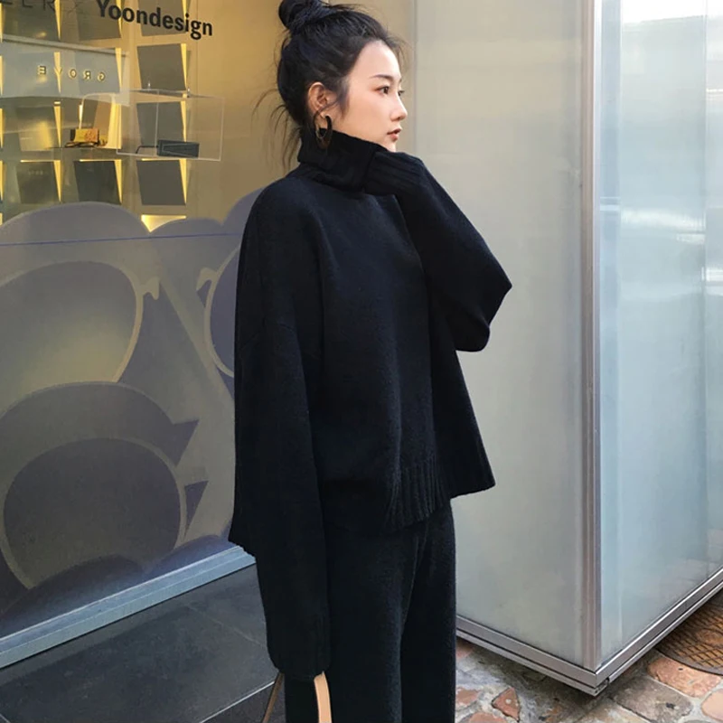 Best Casual Sweater Pants Knitted 2 Pieces Set Turtleneck Pullovers & Elastic Waist Pants Women Sweater