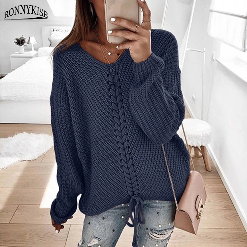 Best RONNYKISE Sexy V-neck Lace Up Knitted Sweaters Long Sleeve Solid Stitching Loose Sweater Autumn Win