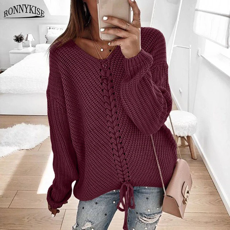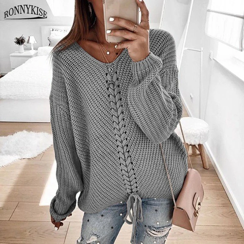 Buy RONNYKISE Sexy V-neck Lace Up Knitted Sweaters Long Sleeve Solid Stitching Loose Sweater Autumn Win