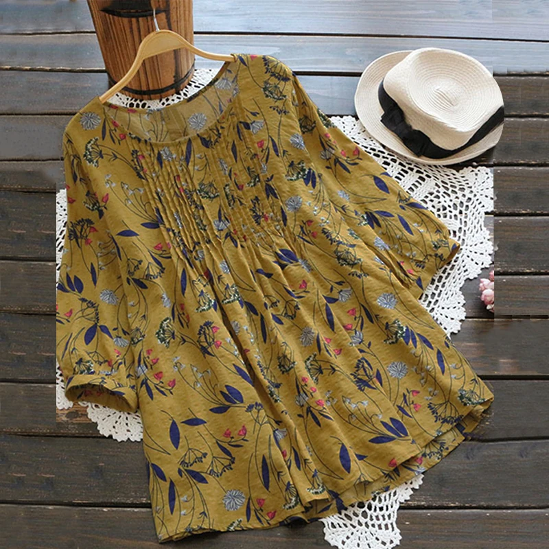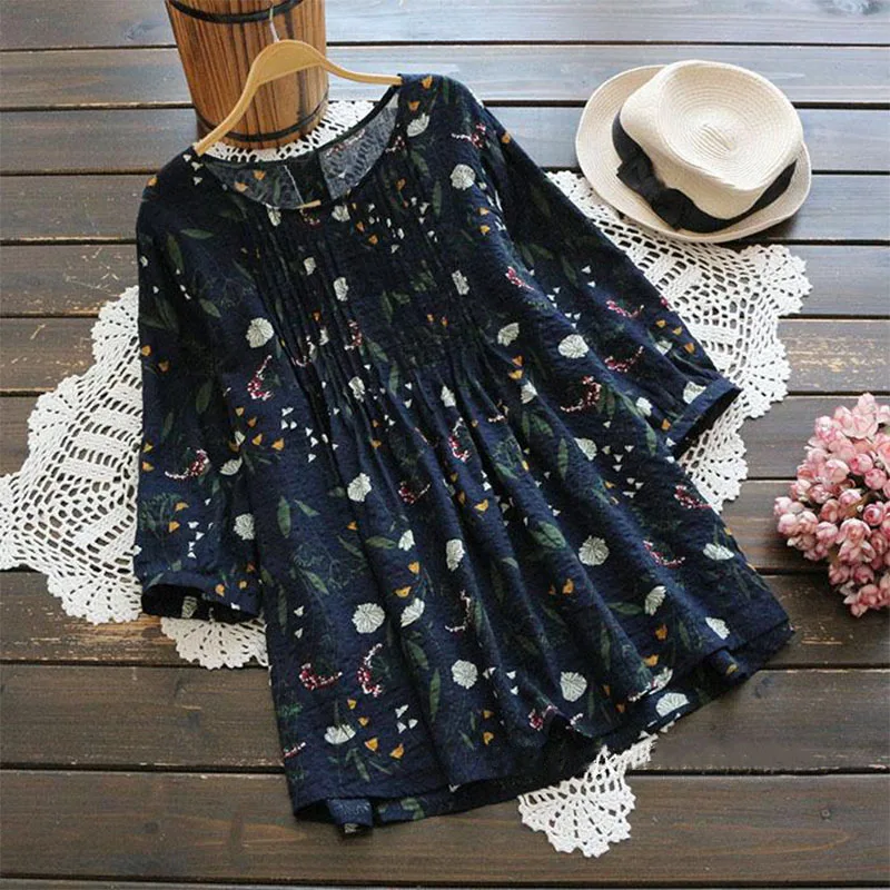 Promo Plus Size ZANZEA 2019 Summer Women Blouse Loose Floral Print Shirt Linen Cotton Top 3/4 Sleeve Blus