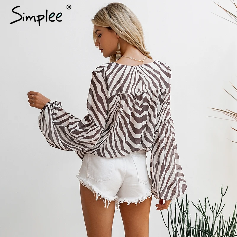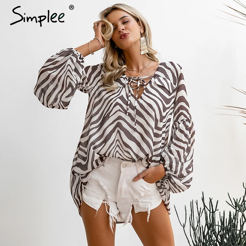 New Simplee Zebra stripe printed women blouse shirt Plus size female top shirt Elegant v neck lace up l
