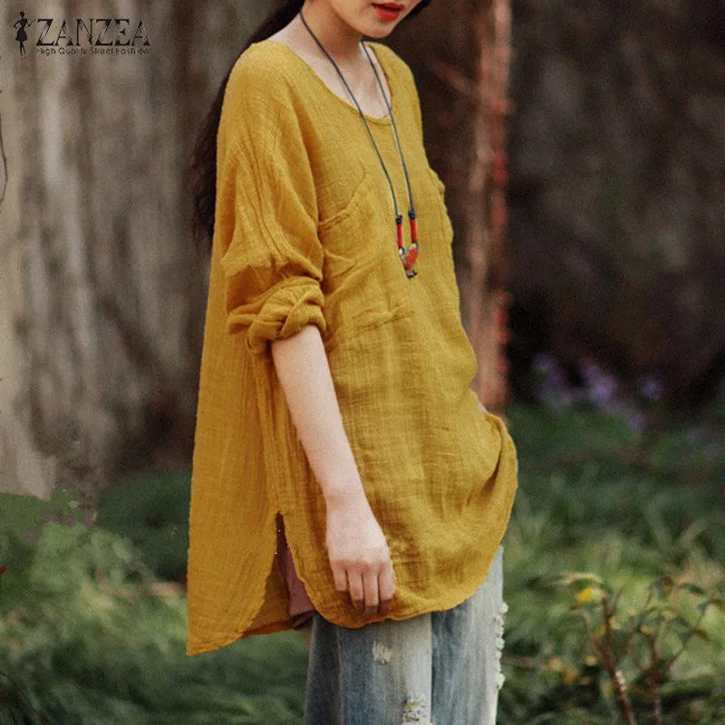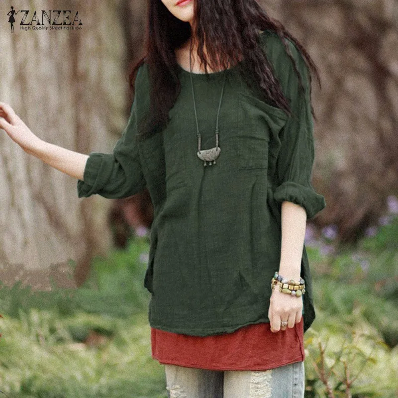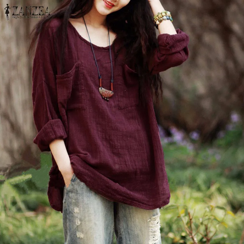 Best Oversized 2019 Autumn ZANZEA Women Blouses Tops Casual Loose O Neck Long Sleeve Pockets Cotton Soli