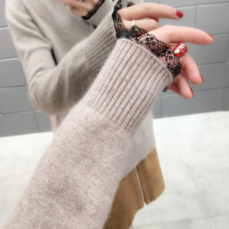 Promo TIGENA Elegant Lace Turn-down Collor Sweater Women Jumper 2019 Autumn Winter Long Sleeve Knitted Pu