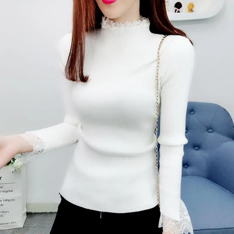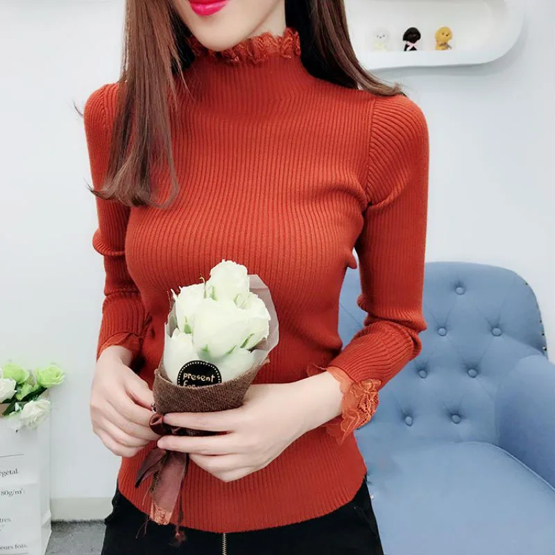 Promo Lucyever Sweet Lace Patchwork Knitted Sweater Women Long Sleeve Turtleneck Stretch Sweaters Woman W