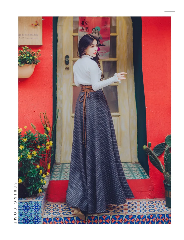 Best 2019 winter Flare Sleeve Turtleneck Lady Ruffle Sweater +Vintage plaid wool Maxi Skirt two piece wo