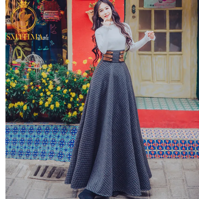 Promo 2019 winter Flare Sleeve Turtleneck Lady Ruffle Sweater +Vintage plaid wool Maxi Skirt two piece wo
