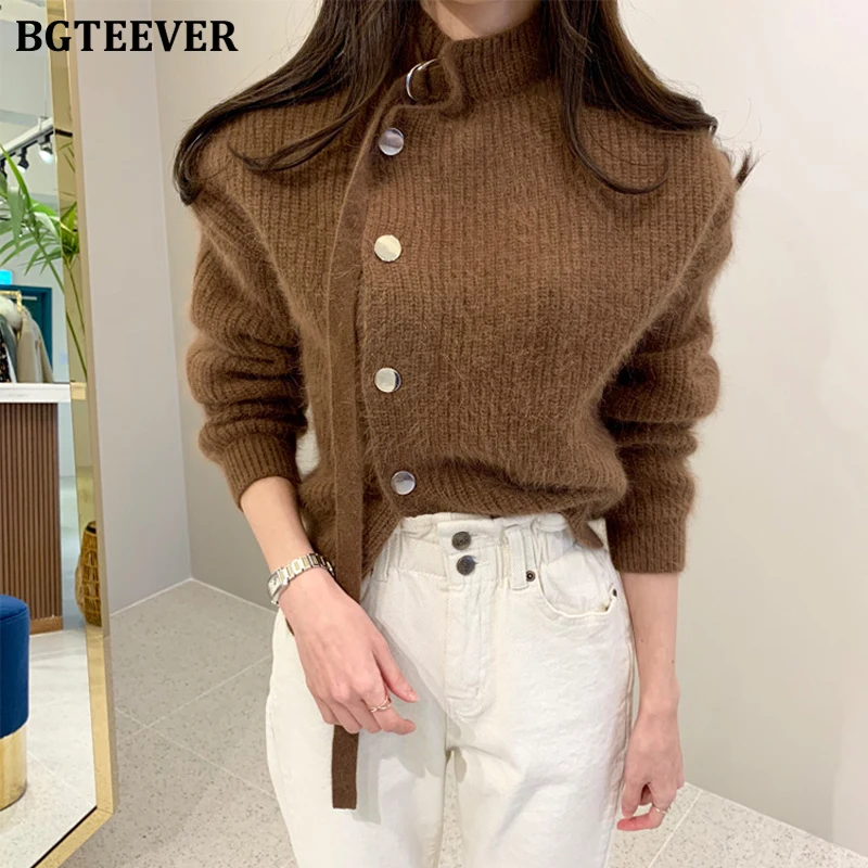 Promo BGTEEVER Streetwear Side-buttons Women Sweater Stand Collar Full Sleeve Female Knitted Cardigan 201