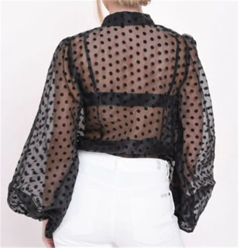 Promo Women Polka Dot Retro Blouse Lady Early Autumn Modern Mesh Shirt Vogue See-through Loose Button Puf